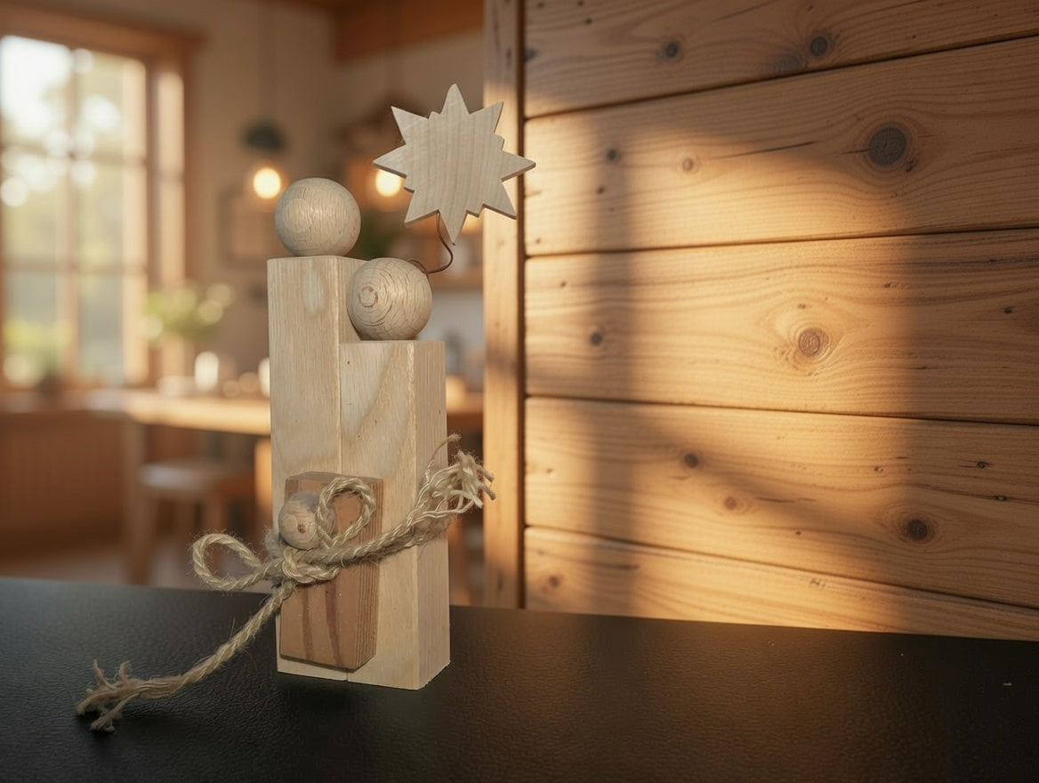 The Holy Family is handcrafted in Germany with great attention to detail. Wooden spheres are carefully selected, drilled, and sanded. Then the body shapes of the figures are created, and an artfully milled wooden star is also made. After assembly, the ensemble receives a surface of sustainable oil and wax, which protects the wood and gives it a warm, natural tone. Finally, the finished product is securely packaged and shipped.