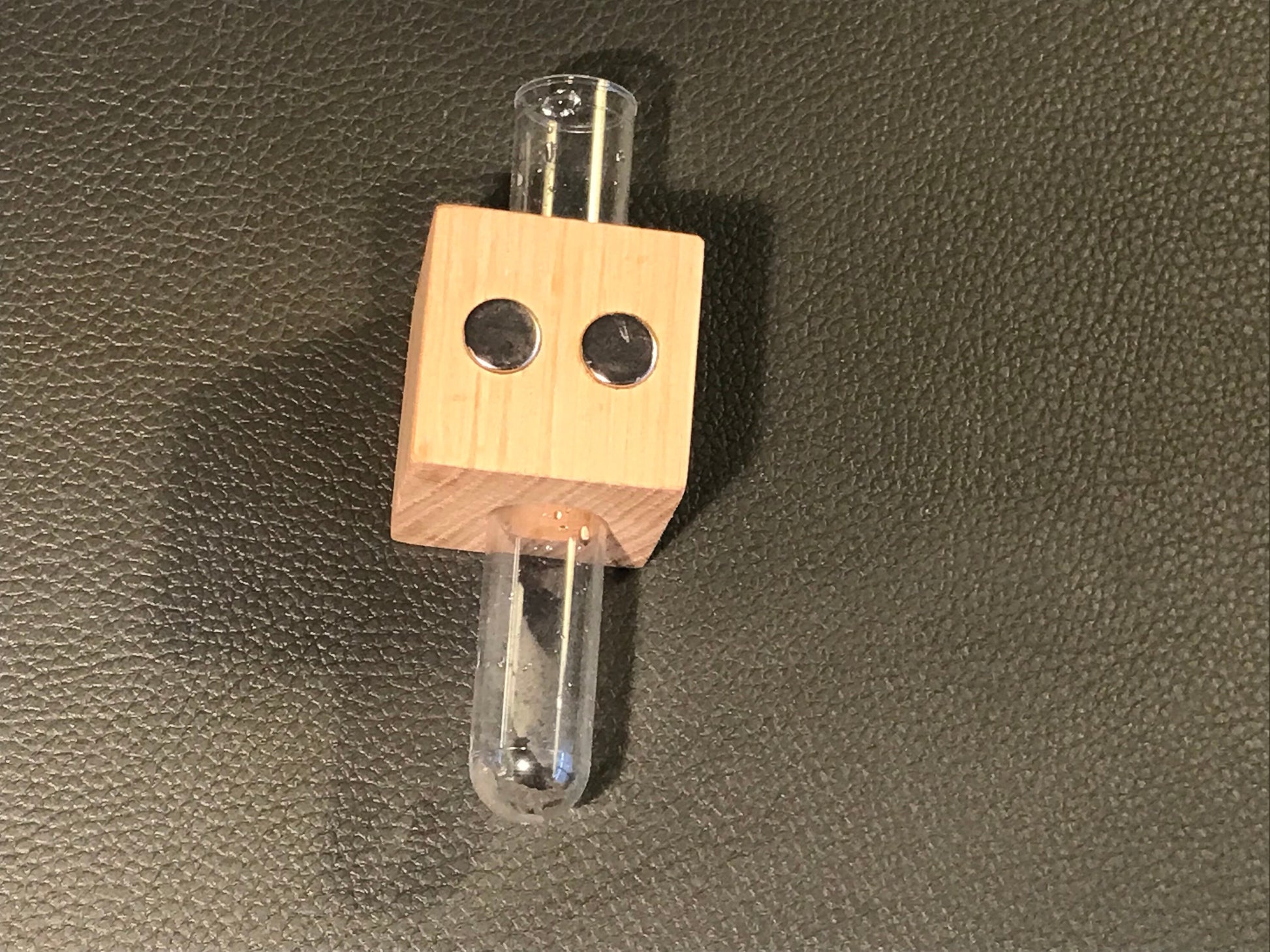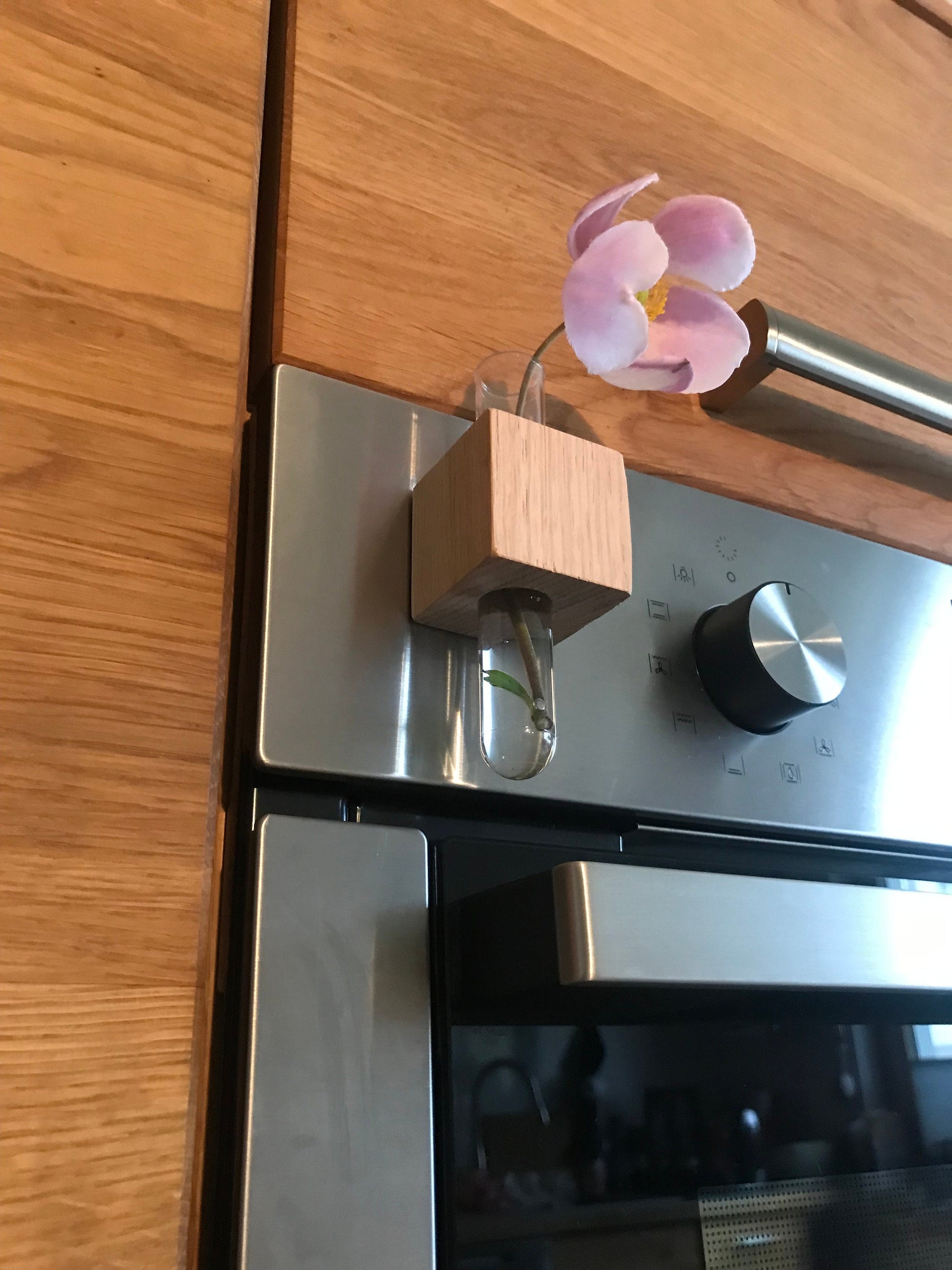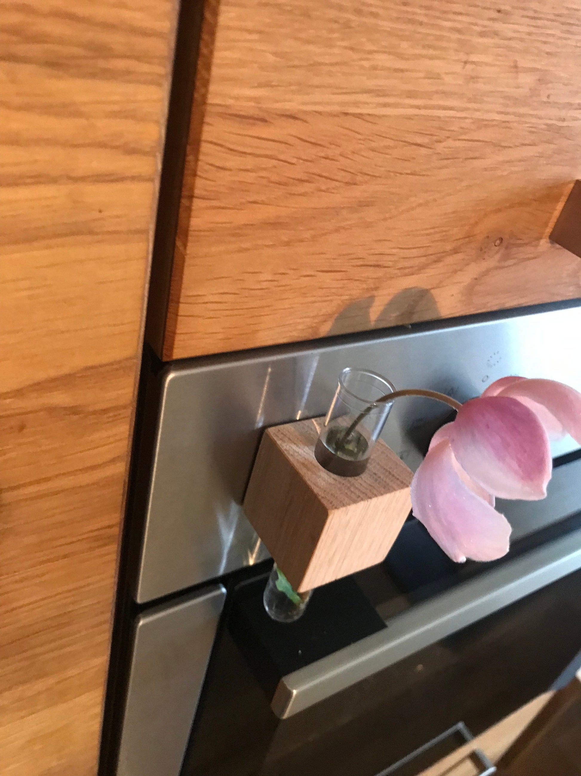 An original and practical magnetic wooden cube with a vase in a subtle and timeless design. The ideal solution for adding a splash of color with a flower. Simply place the cube on a magnetic board or other magnetic surfaces, such as a metal oven or refrigerator door, a memo board, a cabinet, or a magnetic wall in the office, school, hotel, or at home.