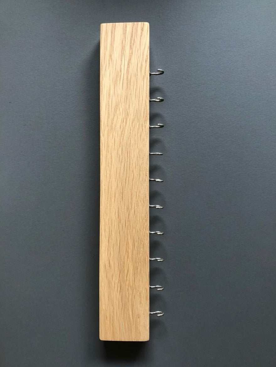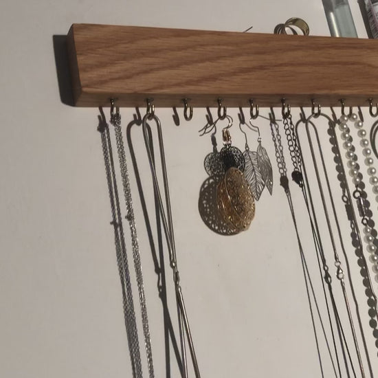 The functional jewelry organizer consists of a solid piece of oak wood. The continuous grain is beautifully visible – an eye-catcher in any room.