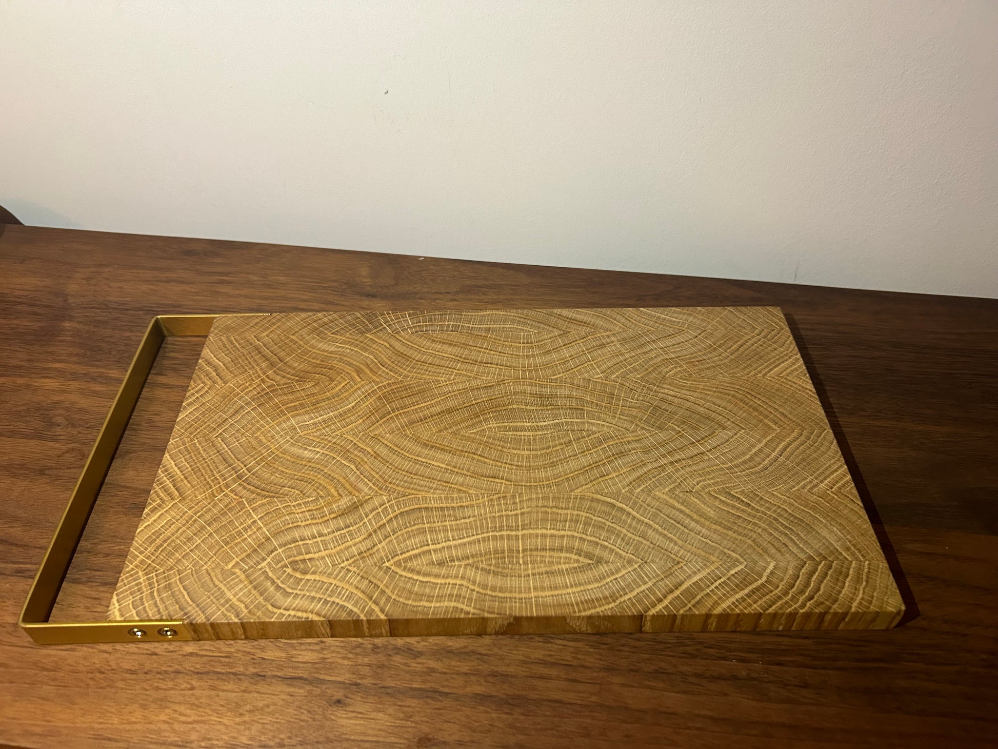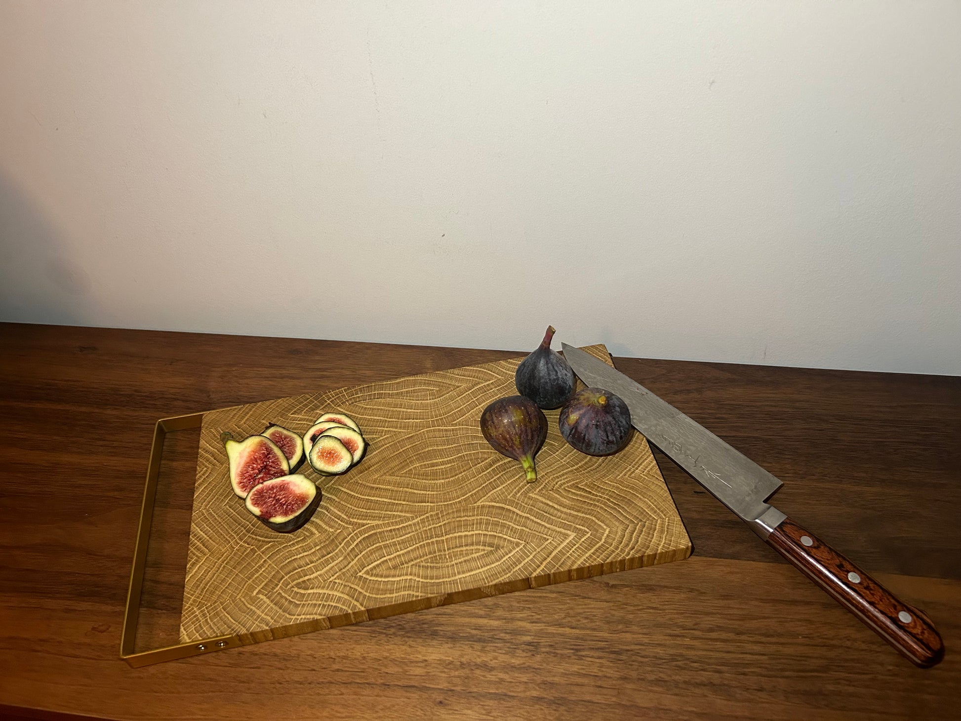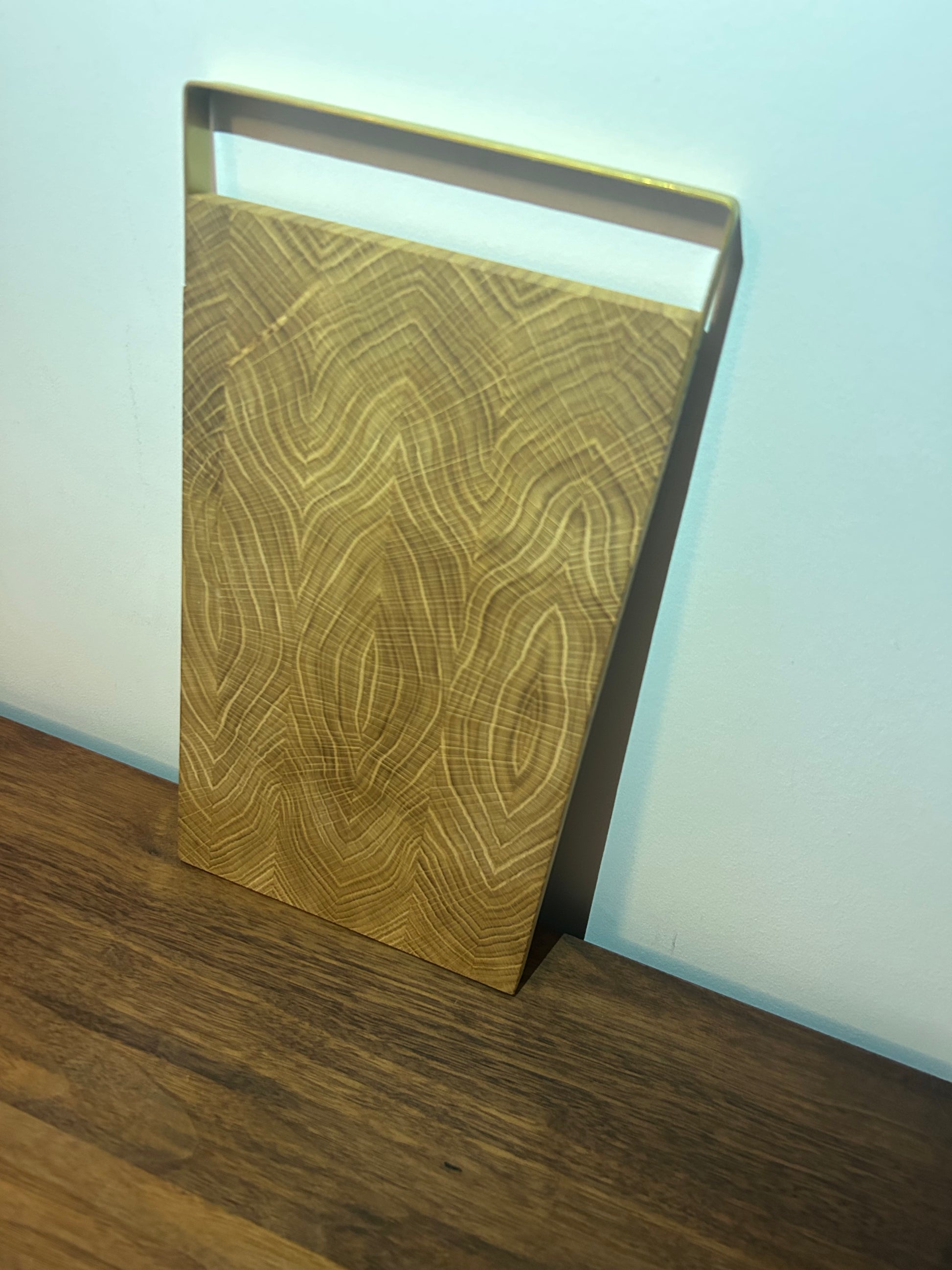 Ein Schneidebrett aus Eiche mit Messinggriff