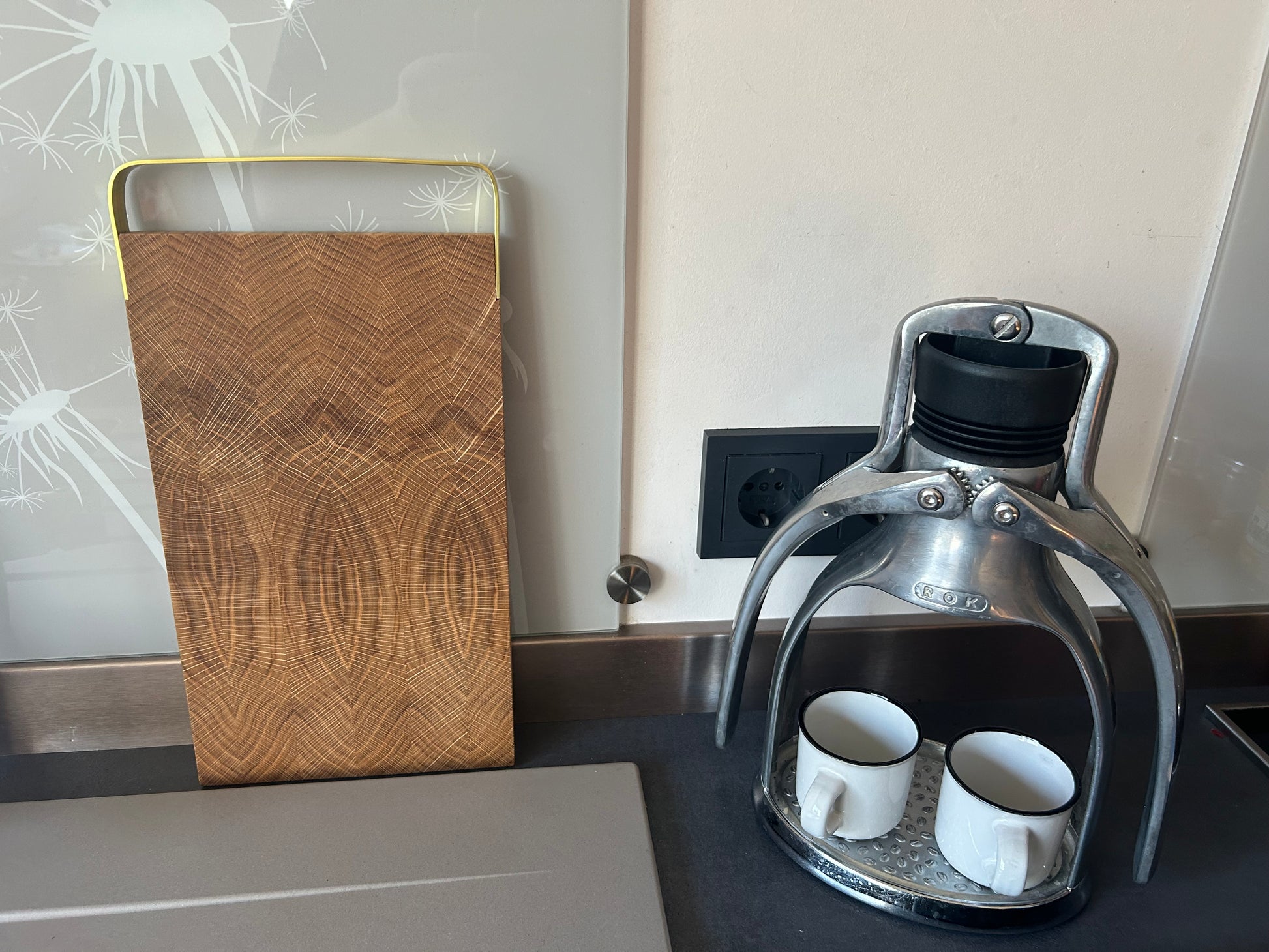 Dieses nachhaltige Schneidebrett wird in liebevoller Handarbeit in Deutschland gefertigt. Das Holz wird sorgfältig ausgewählt, aufgetrennt, gehobelt und verleimt. Danach wird das Brett geschliffen, der Messing-Griff eingearbeitet und mit lebensmittelechtem, nachhaltigem Öl veredelt. Dies schützt das Holz vor Feuchtigkeit und Schmutz und sorgt für einen warmen Farbton.