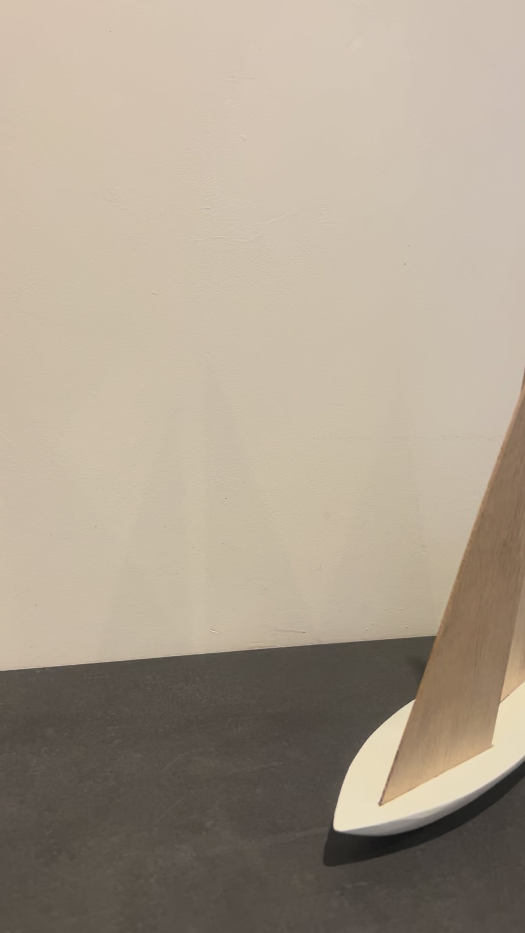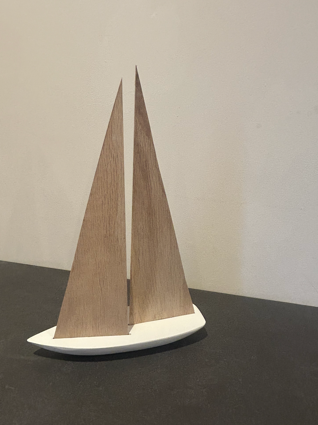 Material: Rumpf aus Pappel seidenmatt weiß lackiert, Segel aus Eiche