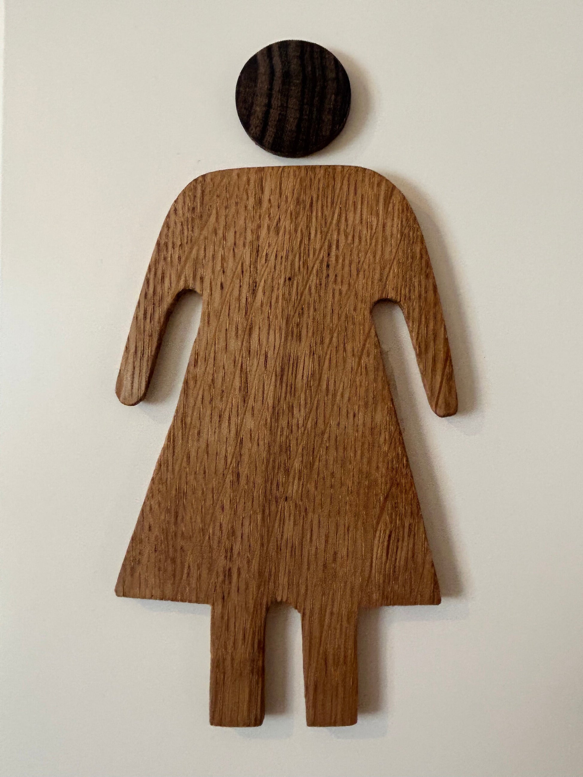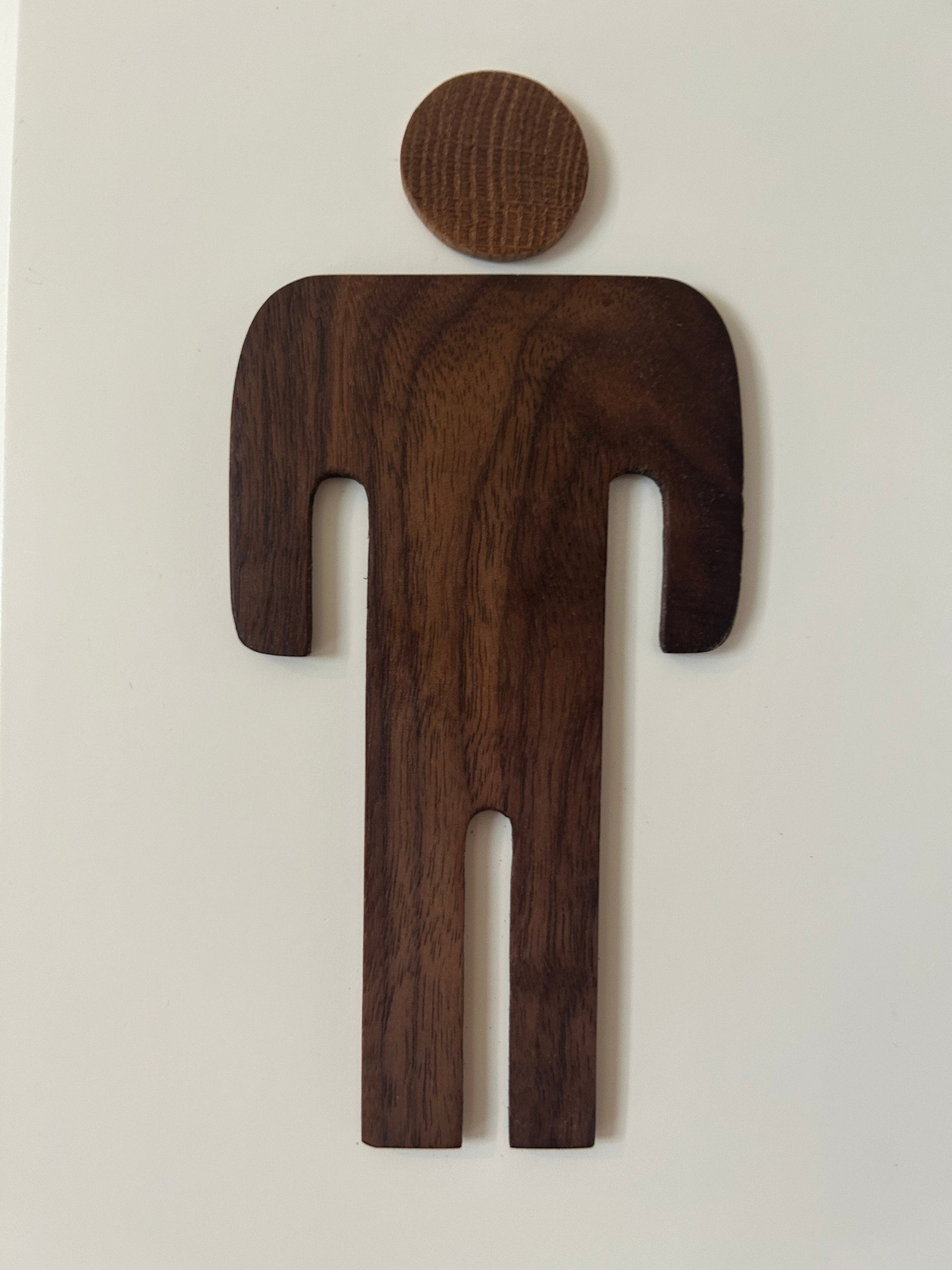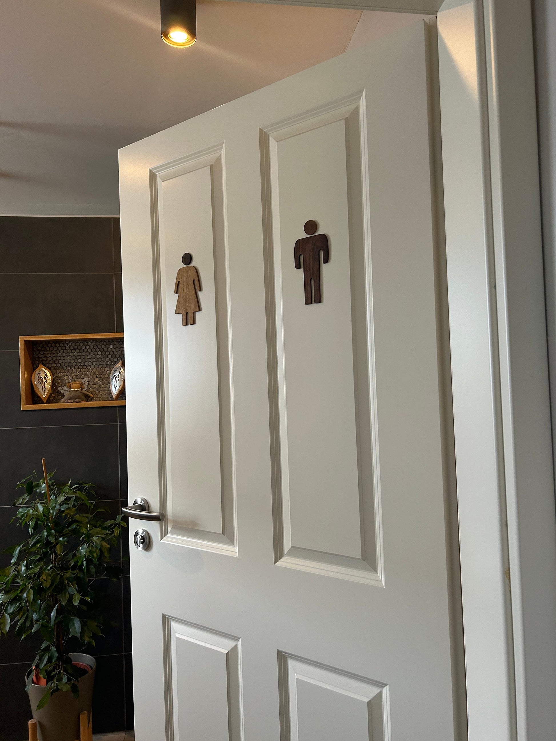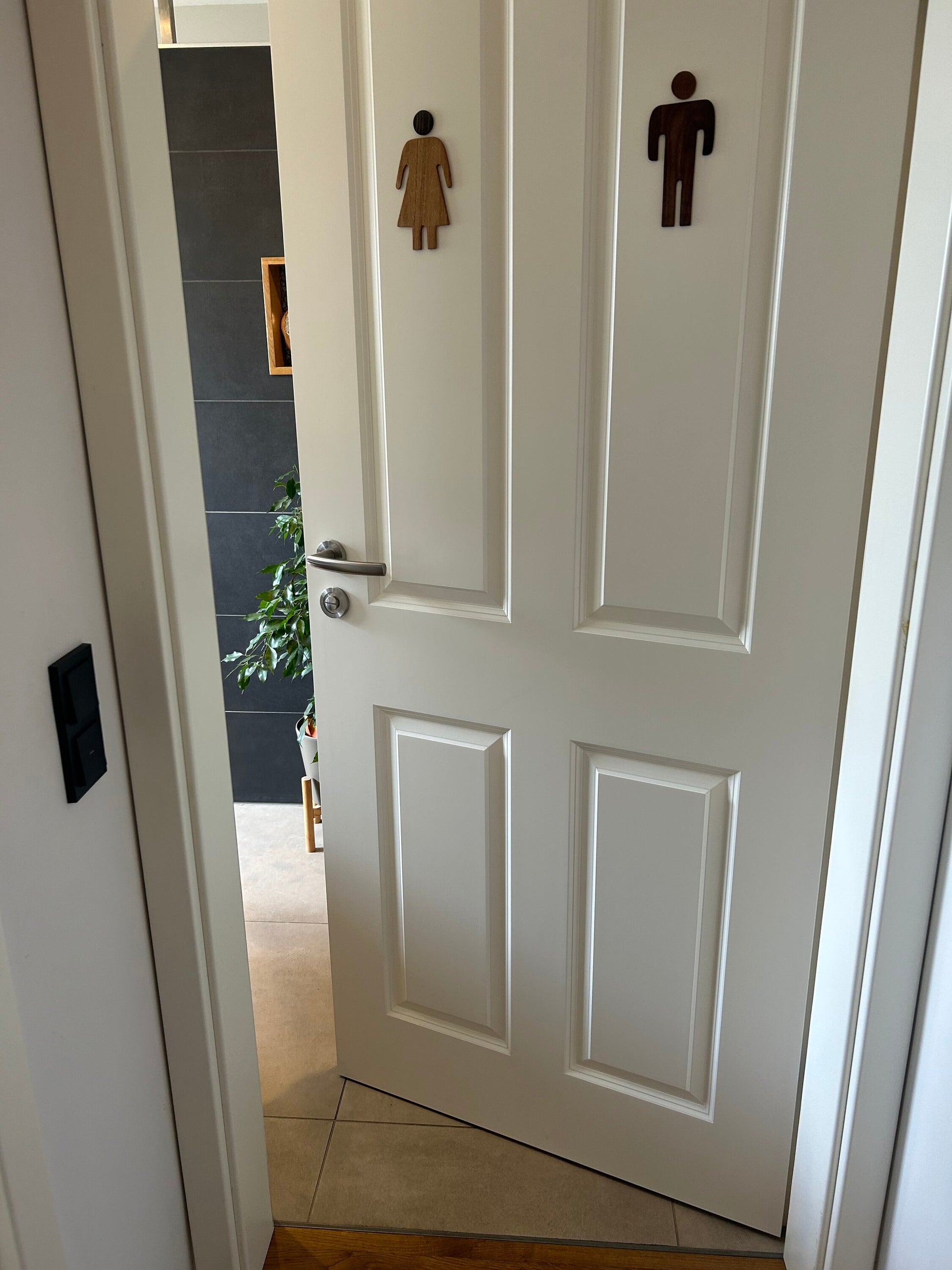 Die funktionalen Toilettenschilder (pro Bestellung eine Frau und ein Mann) bestehen aus massiver Eiche (Frau) und Nussbaum (Mann). So ist die durchgehende Maserung sehr schön zu sehen - ein Blickfang in jedem Badezimmer.