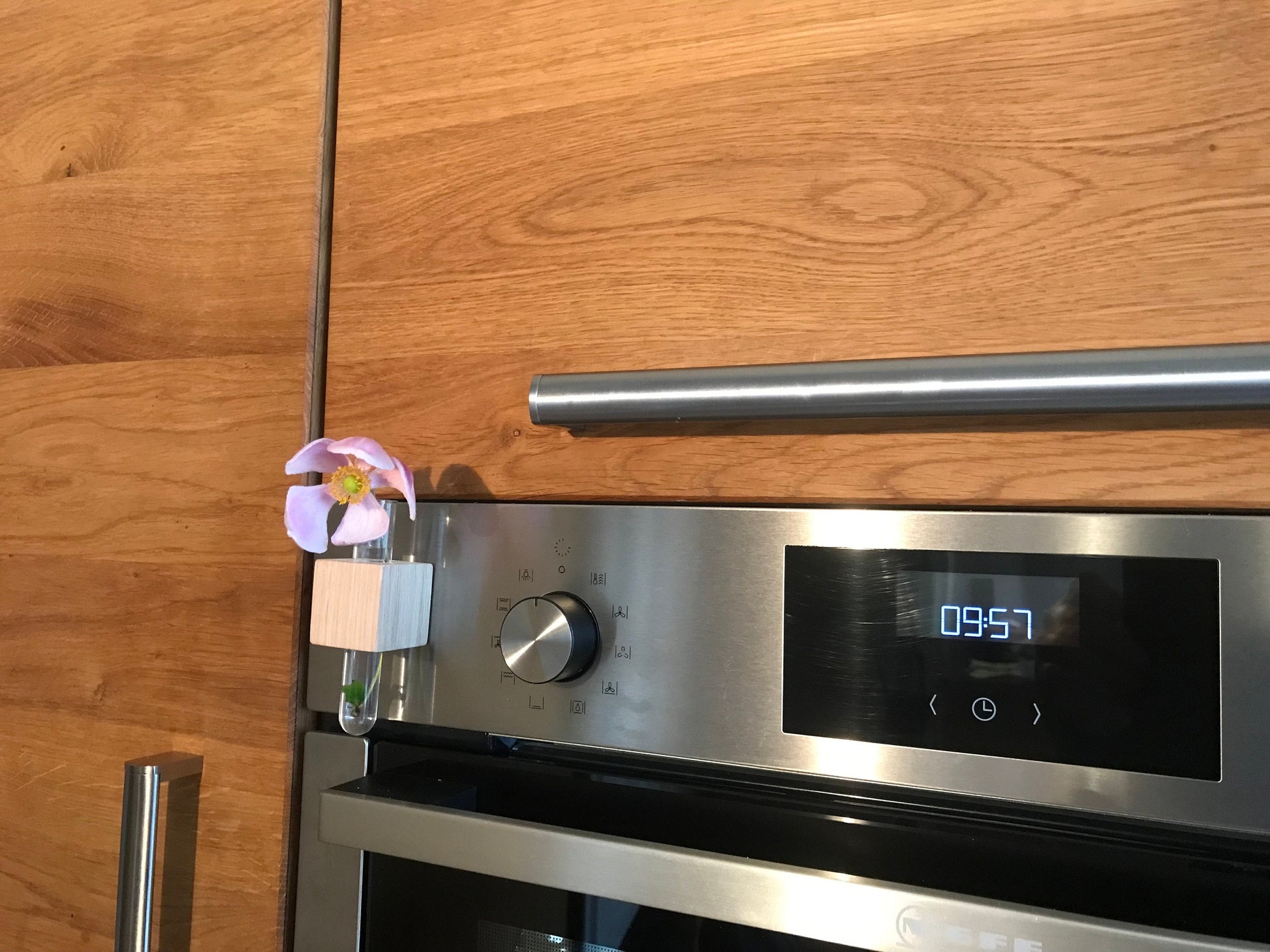 Das Loch für die Blumenvase wird präzise gebohrt. Anschließend wird der Würfel geschliffen, die Magnete auf der Rückseite angebracht und die Oberfläche mit nachhaltigem Öl & Wachs behandelt.